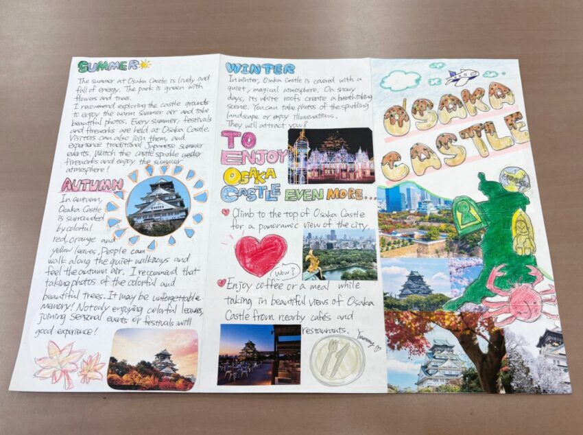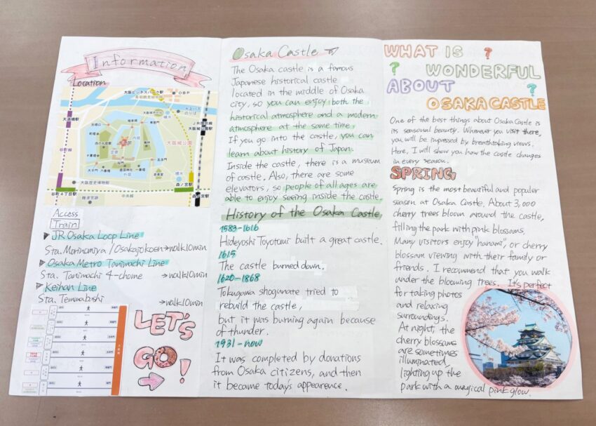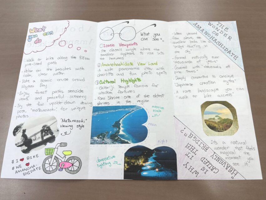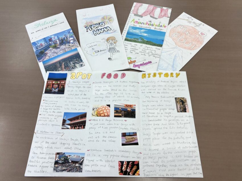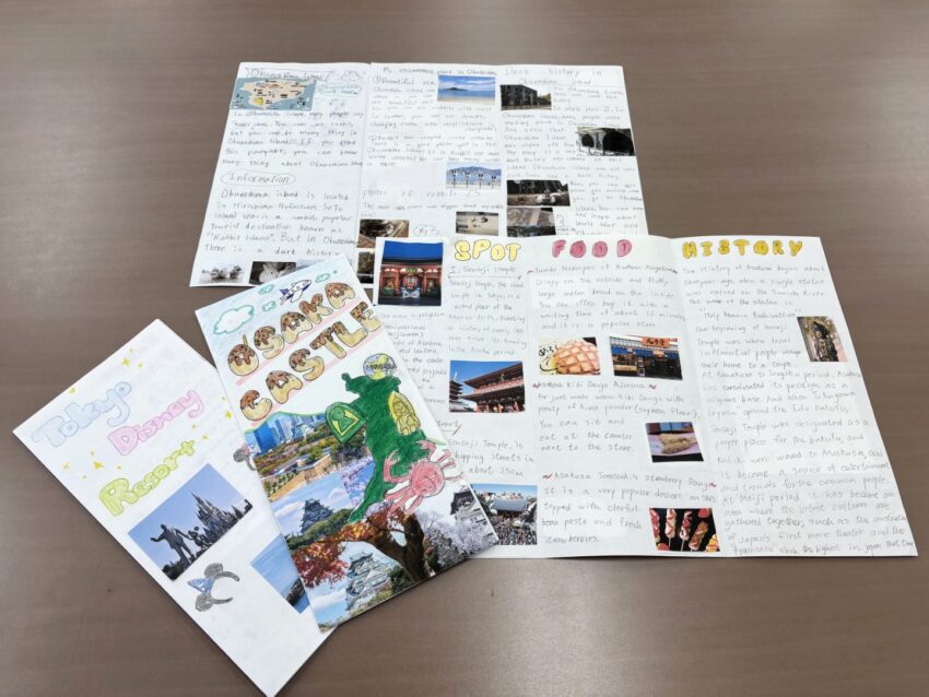 世界中の”wonders”を学んだ後には、集大成となるファイナル・プロジェクトとして日本に目を向け、Japan Wonder Projectを展開し、各自が日本の中から1つの場所を選び、その素晴らしさを多角的にリサーチしパンフレットにまとめスライドを作成し、自分が旅行会社のエージェントになったつもりでプレゼンテーションを行いました。生徒たちは独創性やオリジナリティを遺憾なく発揮し、これまでに培った語彙力や英文構成力を駆使して発表に臨みました。当日は普段の授業担当者以外にも複数のネイティヴ教員と日本人教員のゲスト・ティーチャーも参加し、生徒たちは緊張もしたはずですが、スライドを効果的に使いながら堂々とプレゼンしました。
