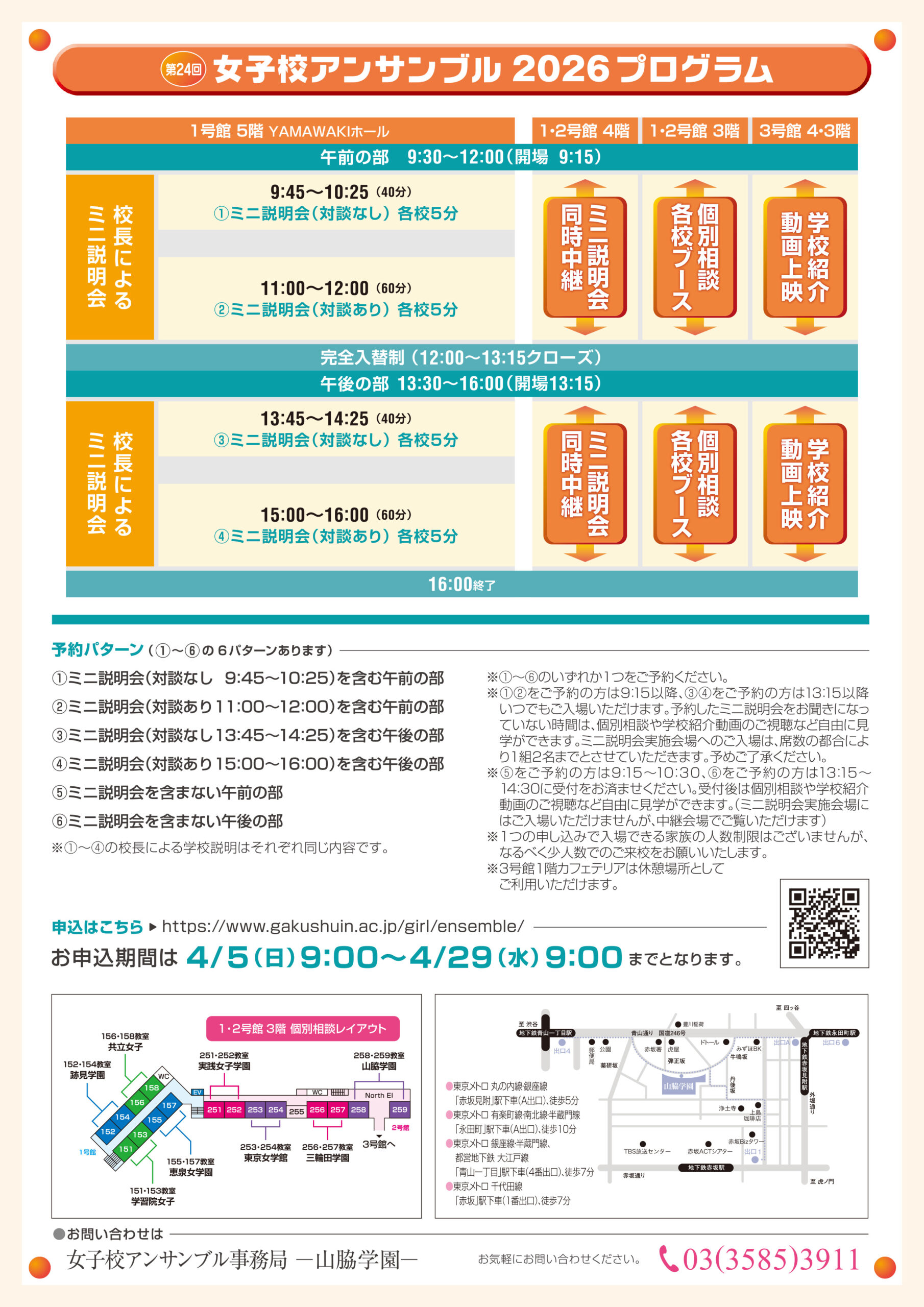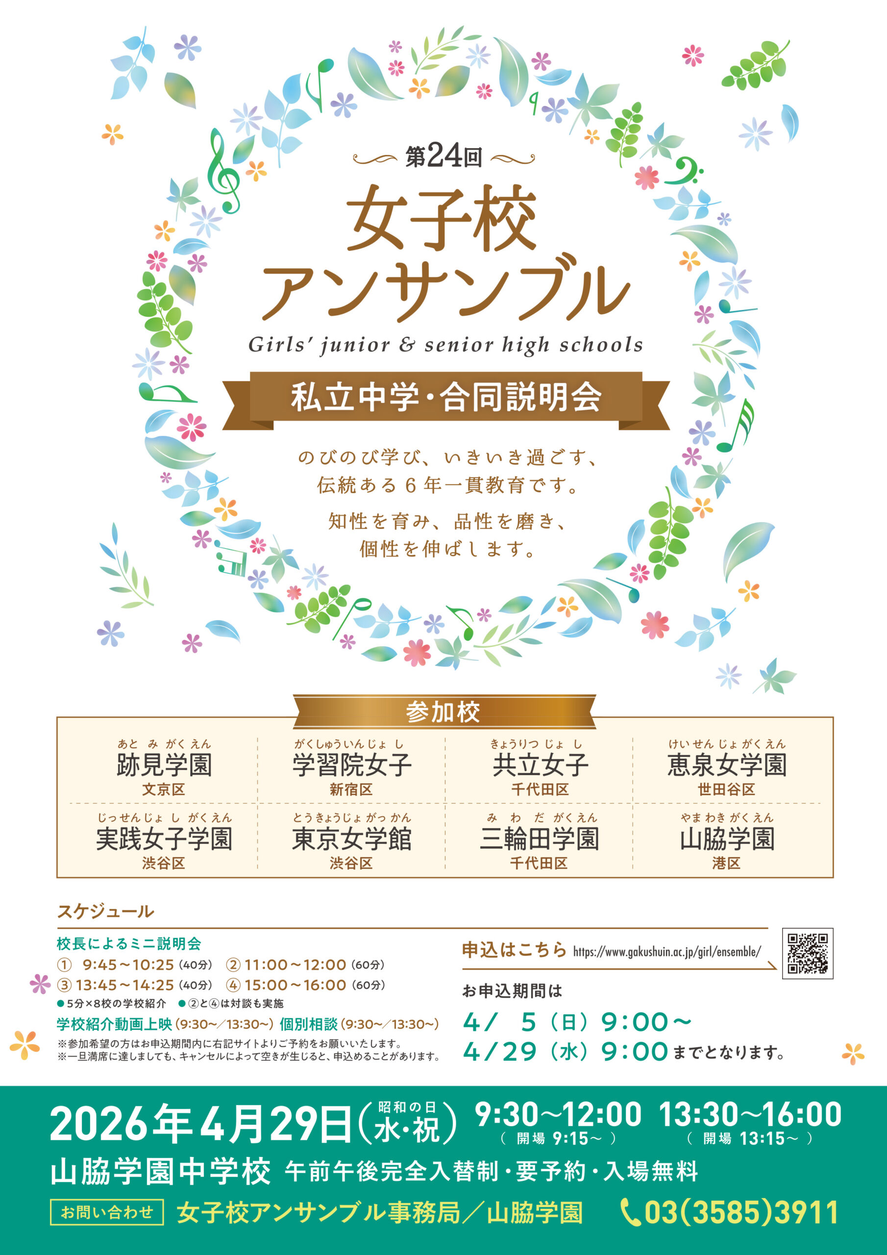 2026年4月29日(水・祝)9:30~16:00、第24回を迎える私立女子中学合同説明会「女子校アンサンブル」(於 山脇学園)に参加いたします。