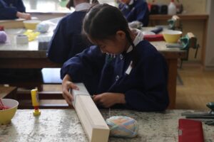 3年生の図工の授業。レインスティック作りに励んでいました。板にくぎを打ち、それをボンドで組み合わせます。中には、自分で用意してきたお豆やビーズを入れ、板を毛糸で巻き付けます。完成したものを静かに振ると、波の音。くぎの打ち方、お豆やビーズなどの素材、毛糸の素材や巻き方などにより、一人一人音が変わってくるのです。