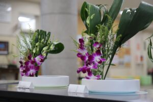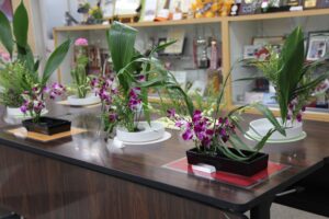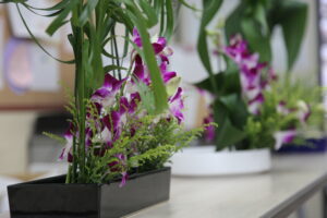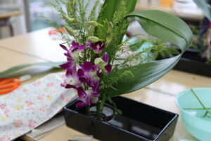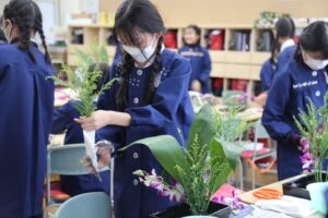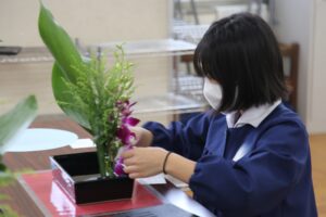 「すずかけ」華道の授業も終盤を迎えました。各学年でまとめの時間を過ごしています。6年生は、小学校で学んだ華道の集大成。様々な場所に作品を展示しています。それぞれに題名がついているのですが、「かがやき」、「華麗」、「ゆらゆら」、「挑戦」、…。題名にも個性があふれています。