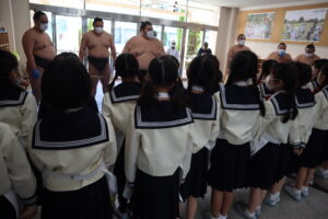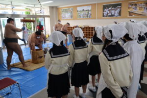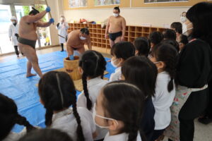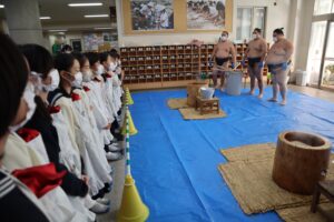 12月12日(金)、もちつき大会がありました。毎年、髙田川部屋の力士の方々にご協力いただき、おもちつきの様子を見せていただいています。迫力あるおもちつきに、子どもたちは思わずかけ声が出ていました。つきたてのお餅を各教室で美味しくいただきました。