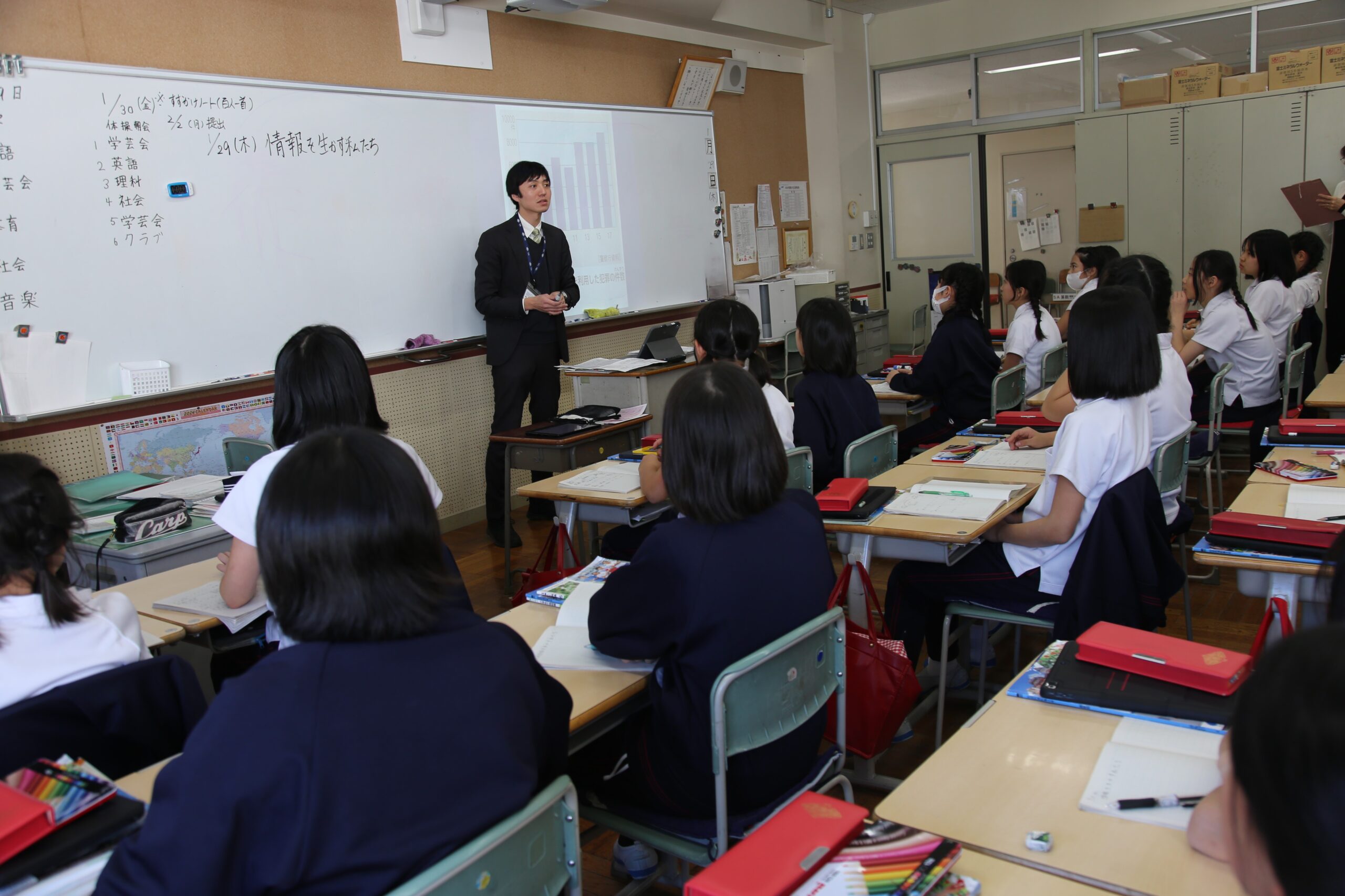 1月29日(木)、5年生は社会科で「情報」について学習しました。情報の妥当性や信頼性を評価・選択する目を養うことが目的です。この授業は、本校の特色ある教育活動「つばさ」とも関連します。よい授業を創る取組「研究授業」として実施し、多くの先生方が参観しました。