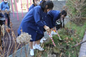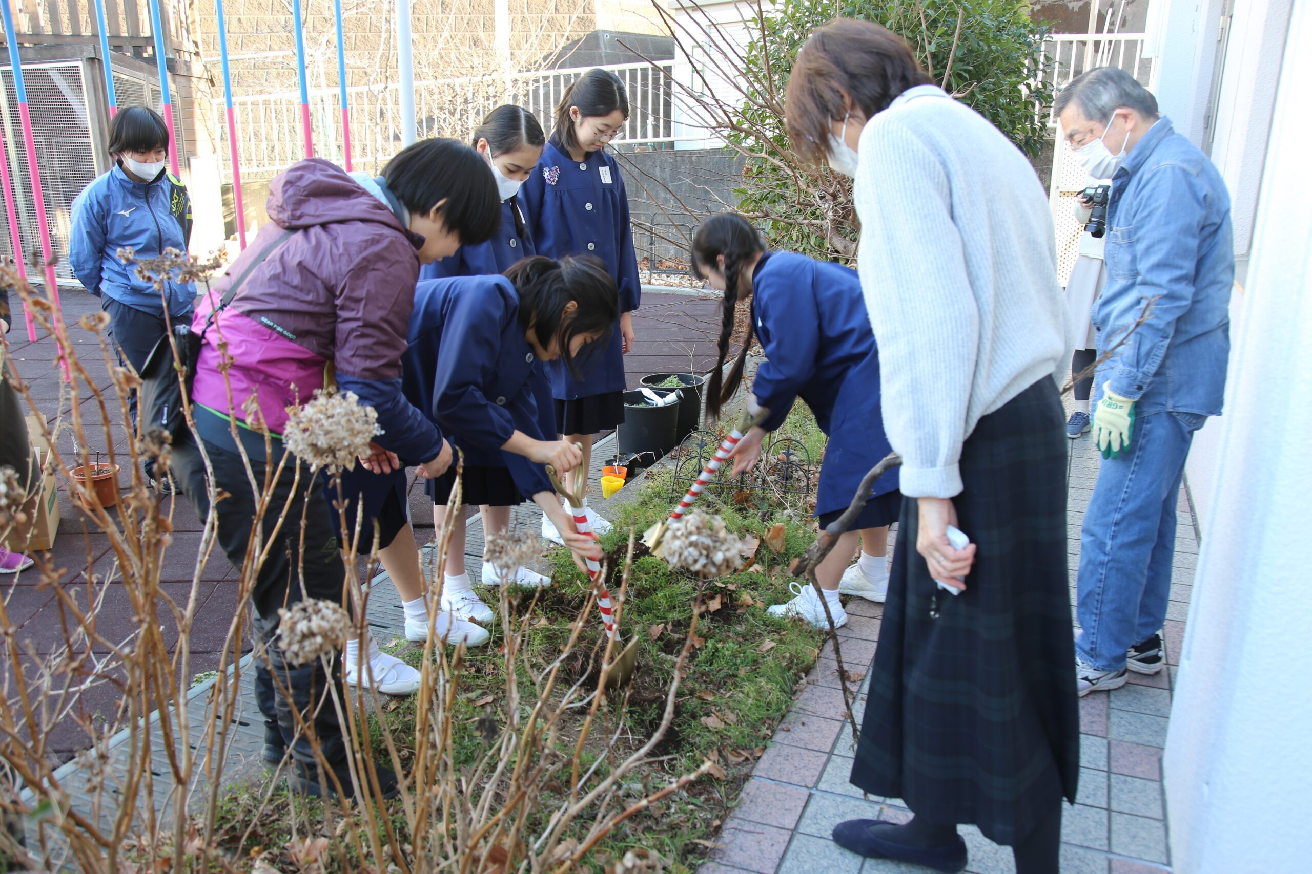 2月2日(月)、中学校、高等学校で育てられていたアンネのバラの一部を、館長先生のご指導のもと小学校の花壇に移植しました。児童委員の子どもたちが大切に鉢から花壇へ植え替えていました。最後はたっぷり水をあげて、大きく育つことを願いました。