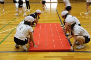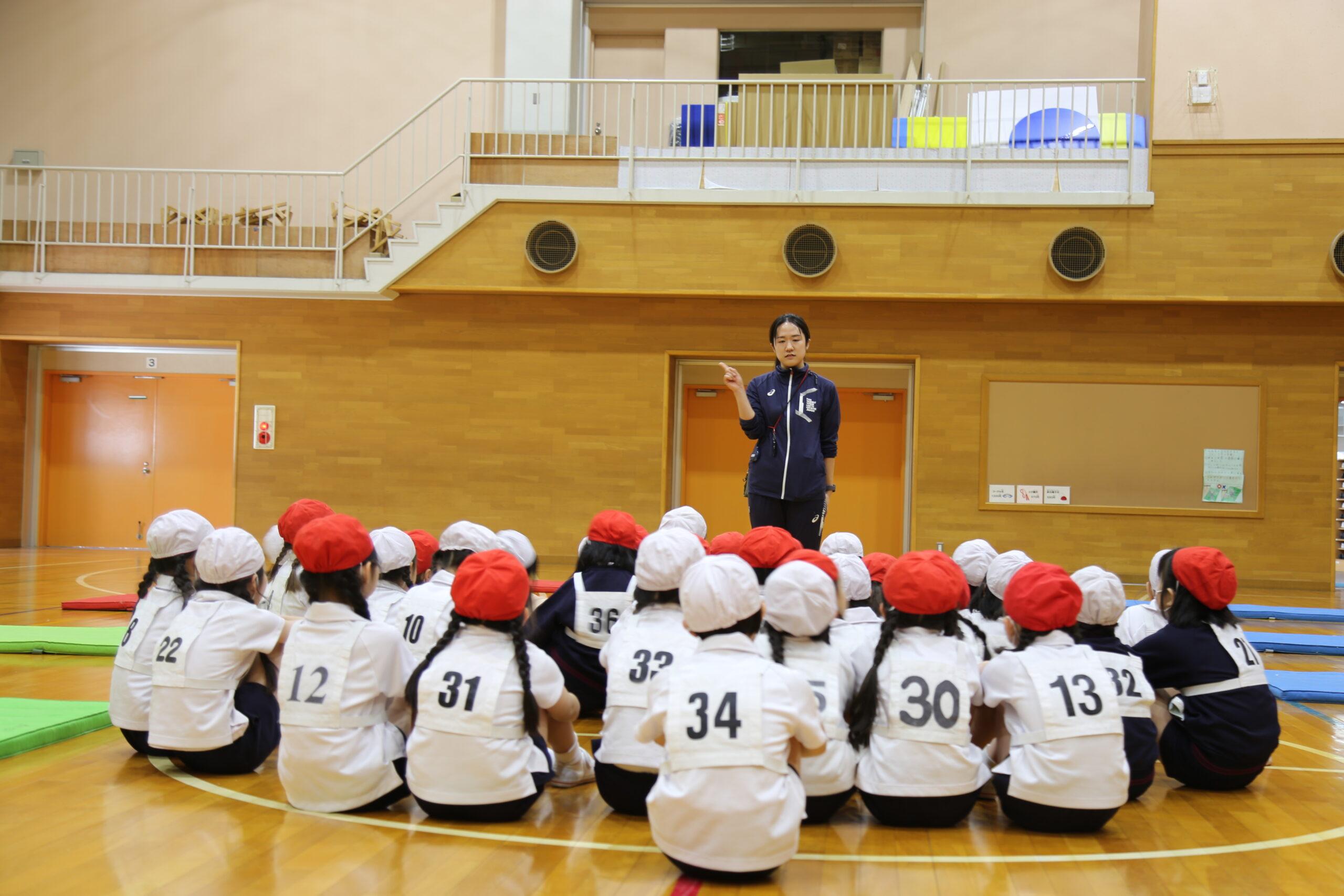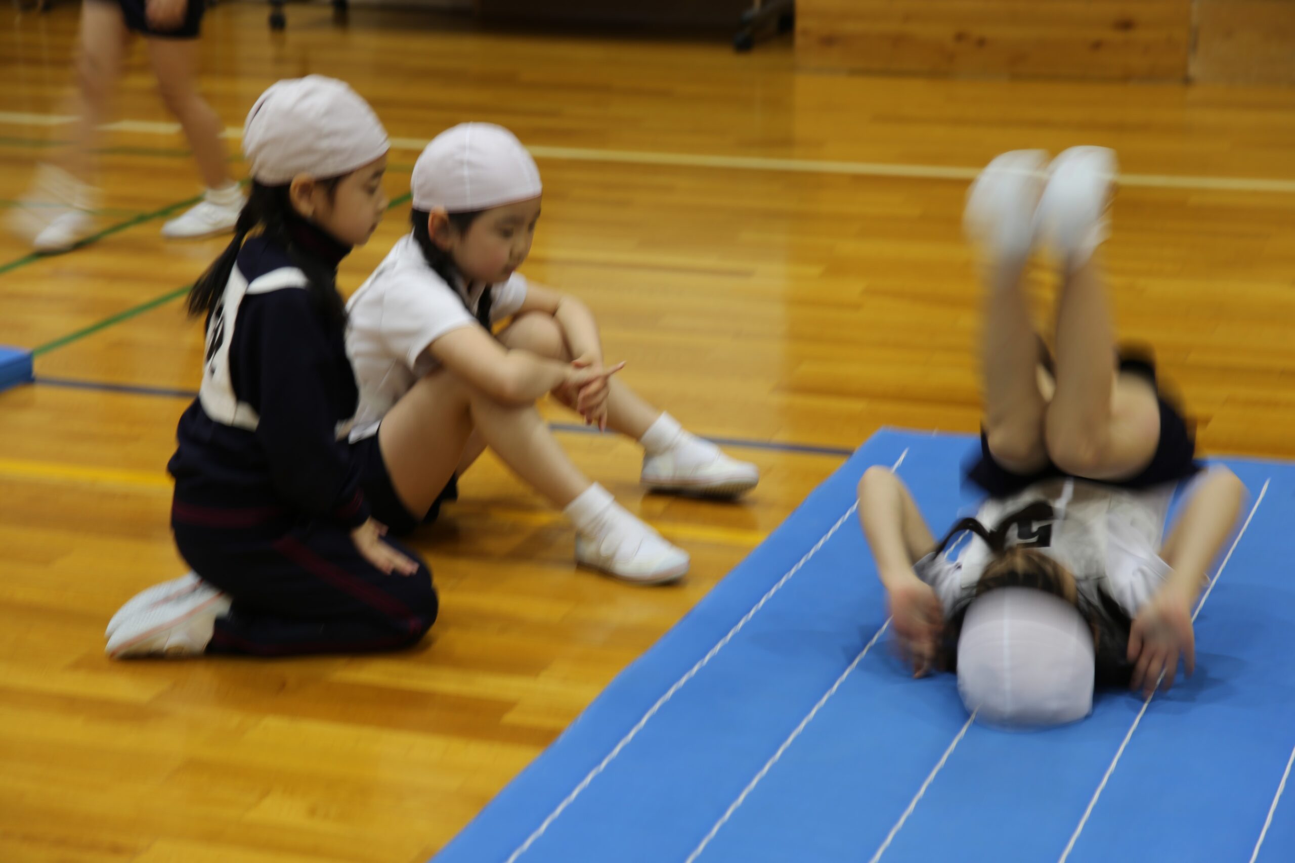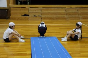 2年生の体育の授業。マット運動に取り組んでいました。まずは、今日の授業の課題を把握します。
