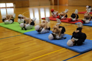 マットをきれいに並べ、学習環境を整えます。それから簡単な準備運動。