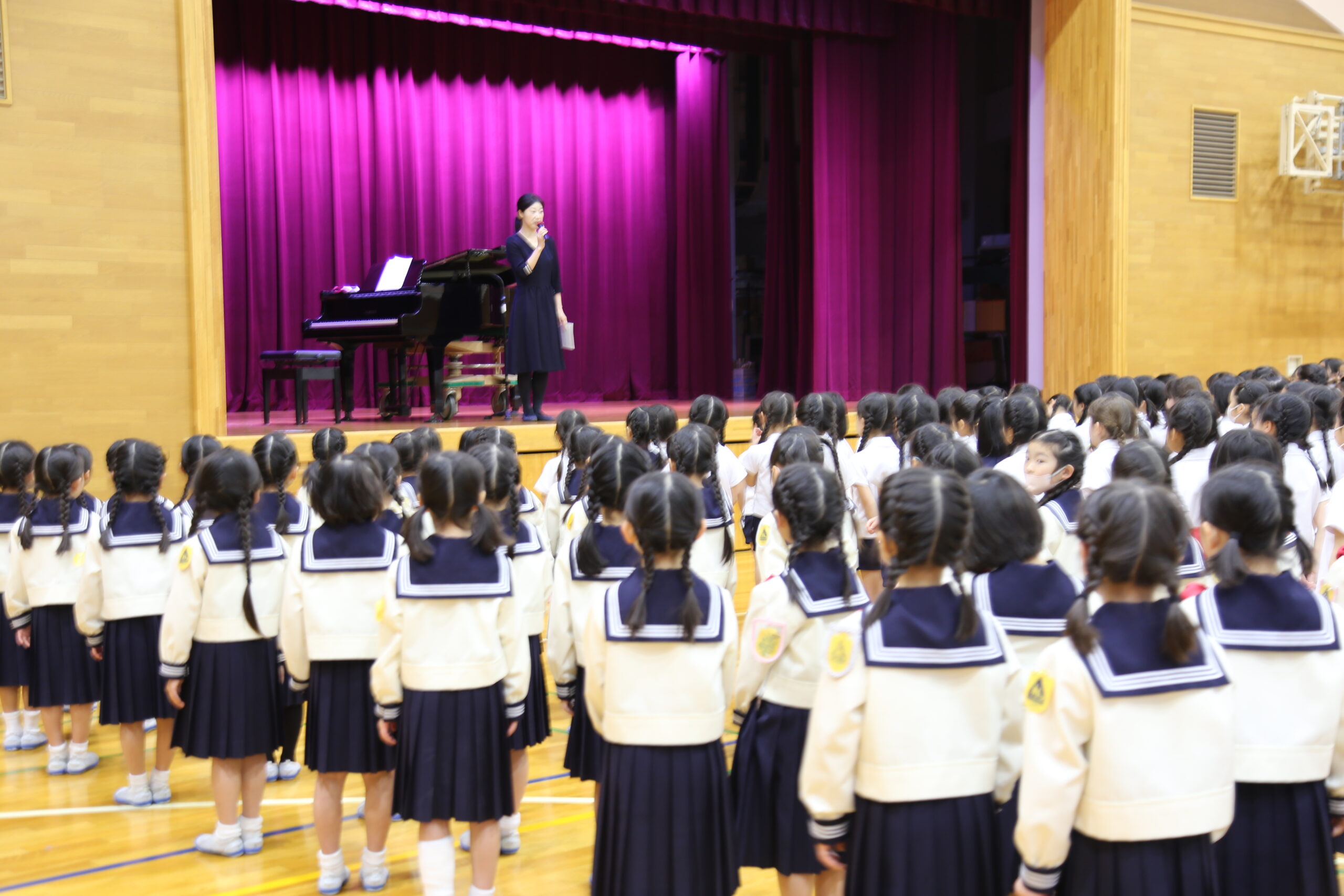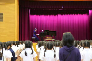 2026/03/19音楽朝会3月19日(木)、今年度最後の音楽朝会。卒業式を終えた6年生の参加はありませんでしたが、1年生から5年生でがばりました。新しい1年生を迎えるため、「ご入学おめでとう」、「1年生さん妹さん」の2曲を練習しました。