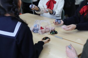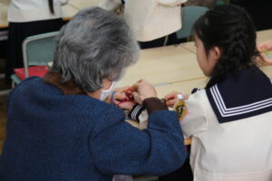 昔の遊びでは、12年生は「あやとり」、34年生は「おはじき」、56年生は「お手玉」を教えていただきました。12年生のあやとりでは「指ぬき手品」や、形が次々と変わる「ほうき→竹やぶの一軒家」などの技に挑戦する姿が見られ、和やかな交流の場となりました。34年生のおはじきでは、指先の感覚を研ぎ澄ませながら、真剣にかつ楽しく対戦する姿が見られました。また、56年生のお手玉では、アドバイスを受けながらリズムよくお手玉を操り、各グループで一体感が生まれていました。