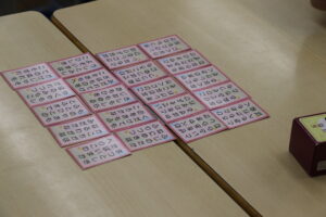 初めての句が多かったけれど、校長先生が「ちょっとした空き時間に上の句を覚えるといいよ」とおっしゃったので、次の句が読み上げられるまで必死で覚えました。上の句で取れた回数は多かったけれど、お手付きを何回かしてしまい2回負けてくやしかったので、もっと上の句も分かる札を増やしたいです。私の好きな句は、「世の中よ道こそなけれ思ひいる 山の奥にも鹿ぞ鳴くなる」です。世の中には悲しみやつらさをのがれる方法などないのだという言葉がしんみりと心にしみます。