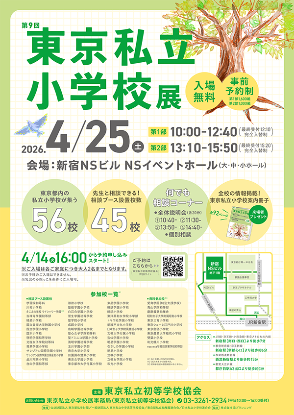 この度、東京私立初等学校協会主催の「第9回 東京私立小学校展」が開催される運びとなりました。本校も本イベントに参加し、個別相談や資料配布等を行う予定です。