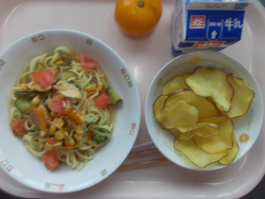 冷やしサラダ中華、トマト、さつまいもチップス、冷凍みかん、牛乳