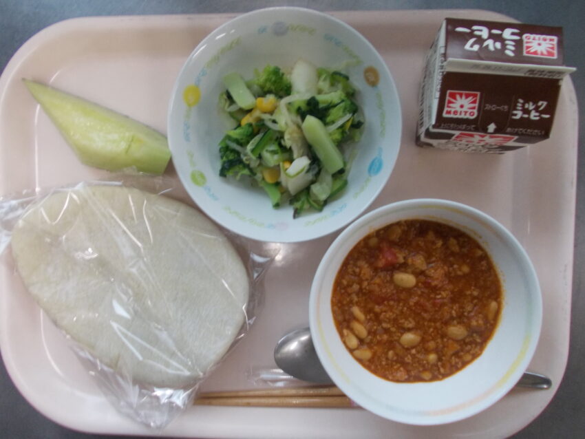ピタパン、チリコンカン、いか入りサラダ、メロン、コーヒー牛乳