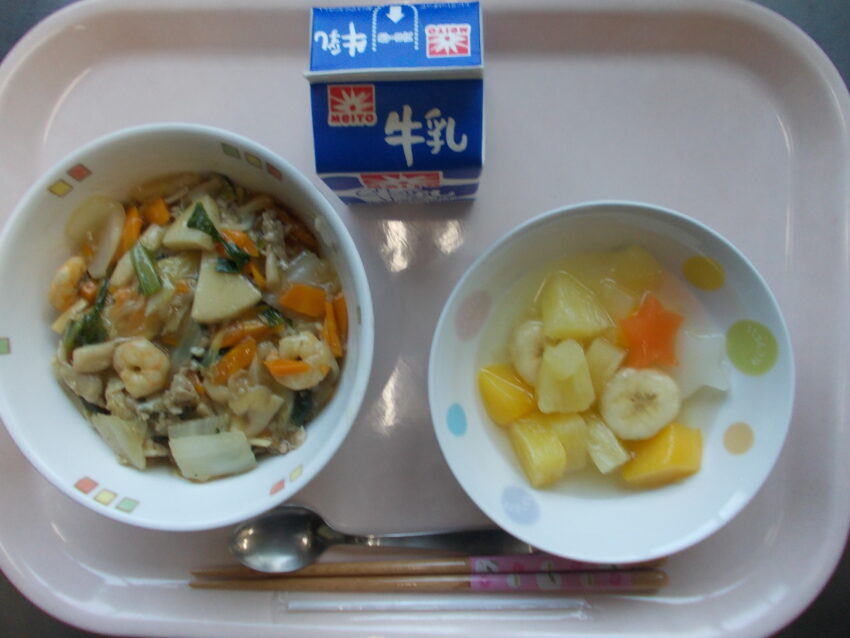 中華丼、フルーツポンチ、牛乳