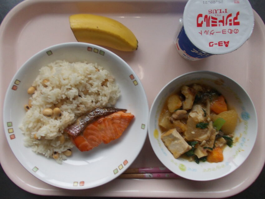 2学期最初の和食の給食は、茹でた大豆を炊きこんだ「豆ごはん」、醤油としょうが汁で漬け込んだ「魚のつけ焼き」、じゃがいもと生揚げ、旬の冬瓜などを入れた「五目うま煮」です。豆ごはんは、好き嫌いのあるメニューですが、大豆と炊きこむことによって「つや」が出てごはんも甘くなるので、好きな児童も沢山います。そして定番のサーモンのは、脂がのって季節を問わず美味しいトラウトサーモンです。サイズは小さいですが、味で満足してもらえたと思います。いつも美味しいお魚を納品してくださいます魚屋さんに感謝ですね。グリンピースごはんの時もそうでしたが、豆ごはんを1・2年生がおかわりに来てくれました。嬉しい誤算です。