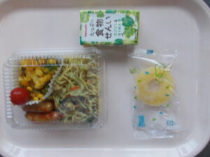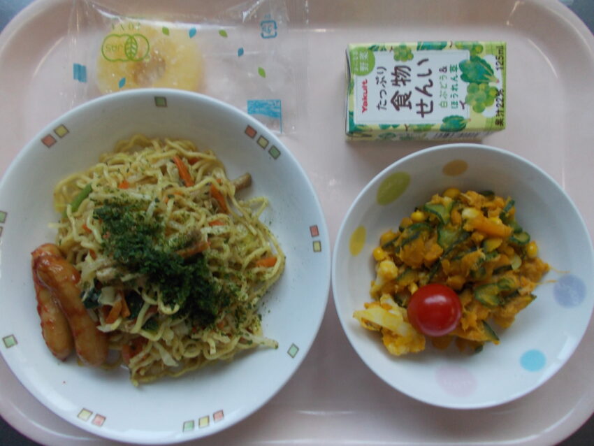 <2・5年お弁当給食>カレー風味焼きそば、青のり、ウインナーソテー、かぼちゃサラダ、ミニトマト、冷凍パイナップル、野菜ジュース