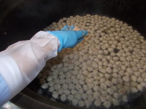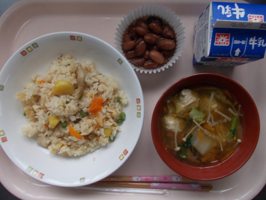 吹き寄せごはんは、秋の旬の食材を入れ彩り豊かに仕上げた炊き込みご飯の事です。人参の赤、しめじの茶色、栗の黄色にいんげんの緑色が引き立つようにベースのご飯は、薄口醤油と塩で濃い色にせず仕上げています。炊き込みごはんは、炊きあがるまで味が分からないので、毎回ドキドキして味見をしますが、「美味し~い!」の声が自然にでる出来栄えです。秋の味覚ですね。そして肉団子の春雨スープは、給食室で良く練った肉だねを、釜のそばで一つずつ丸めて入れました。以前は、数を沢山作れば、肉団子の数を数える必要はないと思っていたのですが、実際は、肉団子の数を数えながら配膳するクラスが多い事を知り、一度スープの中で茹でて、全て数を数え、それぞれにおまけをつけて、1人3個+αのように目安の団子の数を書くようにしています。このひと手間でクラスの配膳が楽になると良いですね。また、久しぶりの甘い煮豆ですが、女学館の児童の皆さんは、豆を良く食べてくれます。完食です。