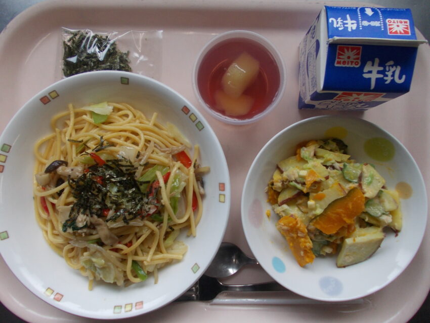 和風スパゲティ、きざみのり、かぼちゃとさつま芋のサラダ、グレープゼリー、牛乳