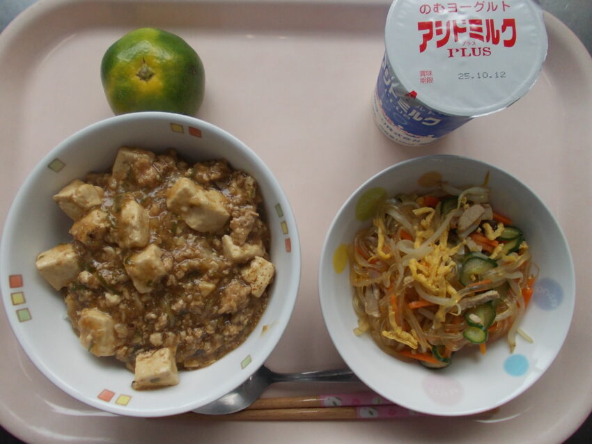 気温が落ち着き過ごし易くなってきましたが、やはり日中は暑いという事で、豆腐屋さんからは押し豆腐を作っていただけないので、代わりに「焼き豆腐」で作ったマーボー豆腐丼です。通常の木綿豆腐よりは焼いてある分やや崩れにくいとはいえ、いつもは崩れるのですが、本日はあまり崩れずに綺麗に仕上げることができました。つるっと食べやすいので、ごはんも進んだようでどのクラスも良く食べました。そして今年はじめての「早生みかん」です。先日早生みかんを食べた給食メンバーが2人ほどいて、今年は甘いという話をしていたのですが、本日納品された早生みかんは、甘さも酸っぱさも「まぁまぁ」という感じでしたね。これも季節の味です。楽しんで味わいましょう。