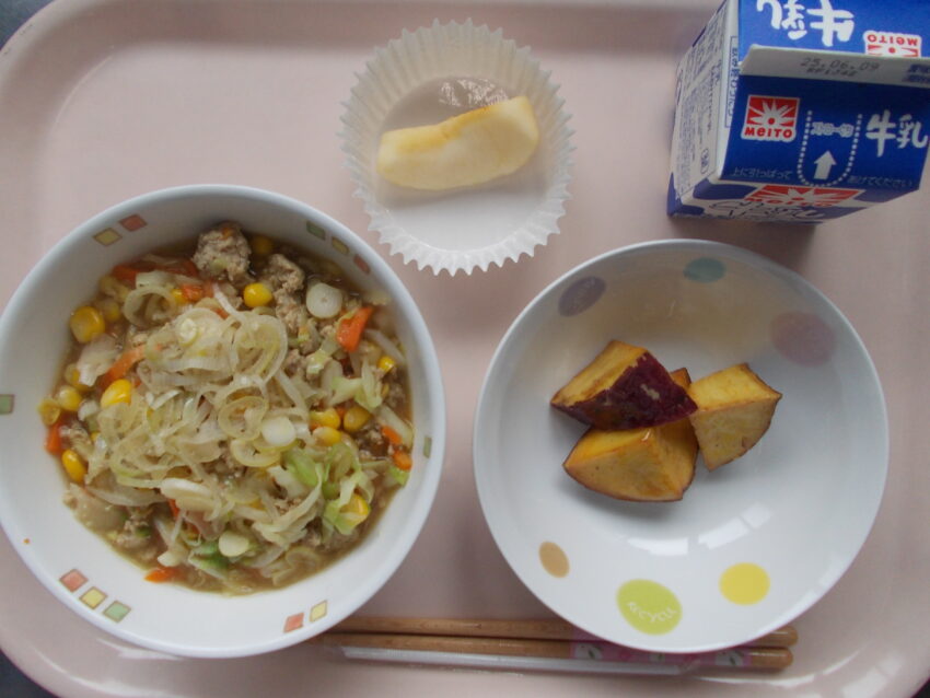 野菜みそラーメン、大学芋、トキりんご、牛乳