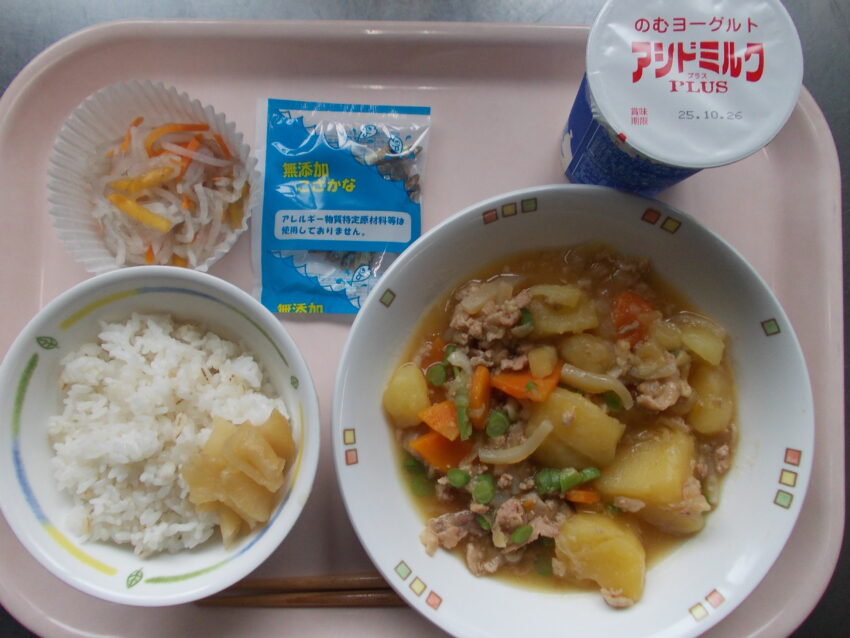 麦ごはん、つぼ漬け、肉じゃが、柿なます、ミニフィッシュ、アシドミルク