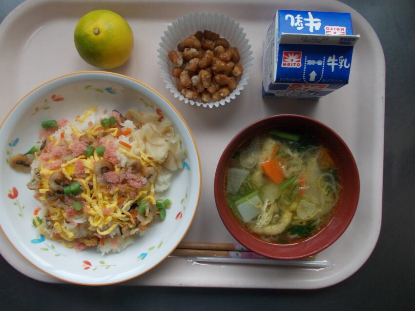 あなご入りちらし寿司、がり、のっぺい汁、大豆あまから、早生みかん、牛乳