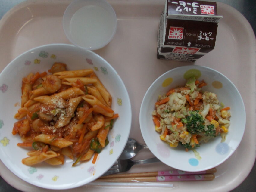 ペンネナポリタン、粉チーズ、花野菜おかかマヨ和え、カルピスゼリー、コーヒー牛乳