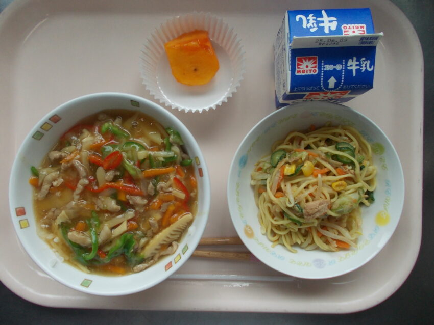 チンジャオロースー丼、ラーメンサラダ、たねなし柿、牛乳