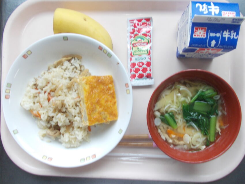 鶏とごぼうの混ぜご飯、ポテトオムレツ、ケチャップ、沢煮椀、バナナ、牛乳