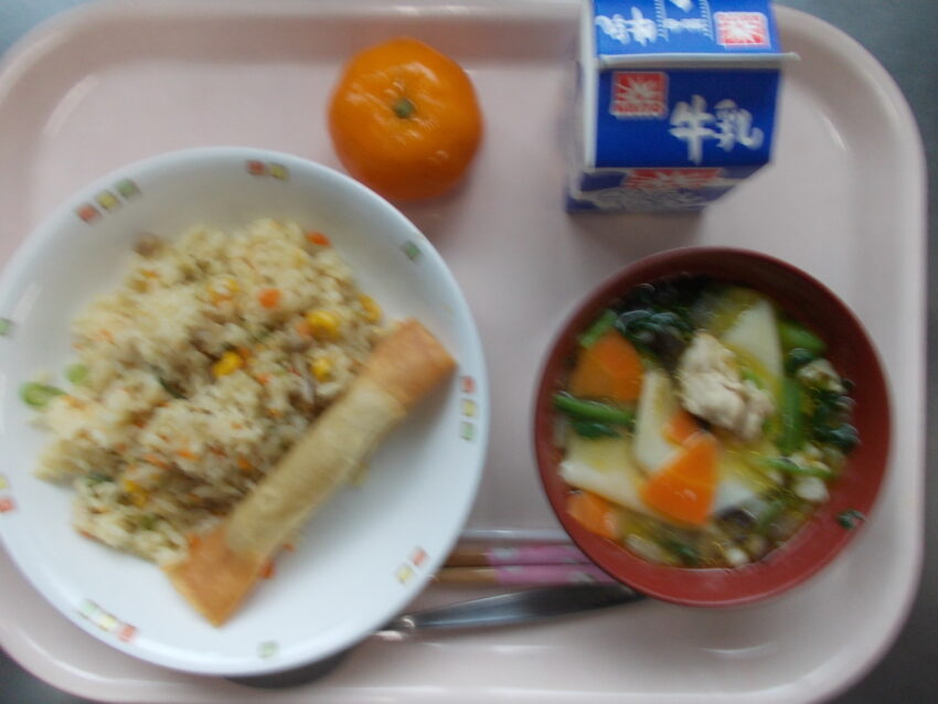 コーン焼き豚チャーハン、ウインナー春巻き、ワンタンスープ、冷凍みかん、牛乳