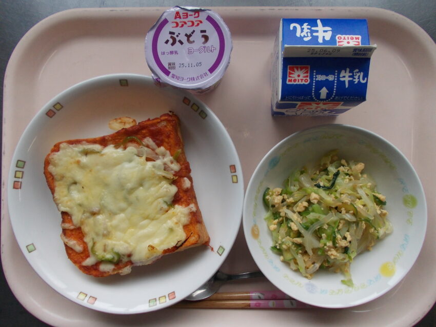 ピザトースト、卵サラダ、コアコアヨーグルトぶどう、牛乳