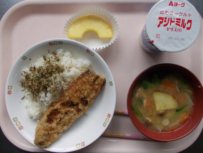 ふりかけごはん、魚のかば焼き、さつま汁、パイナップル、アシドミルク