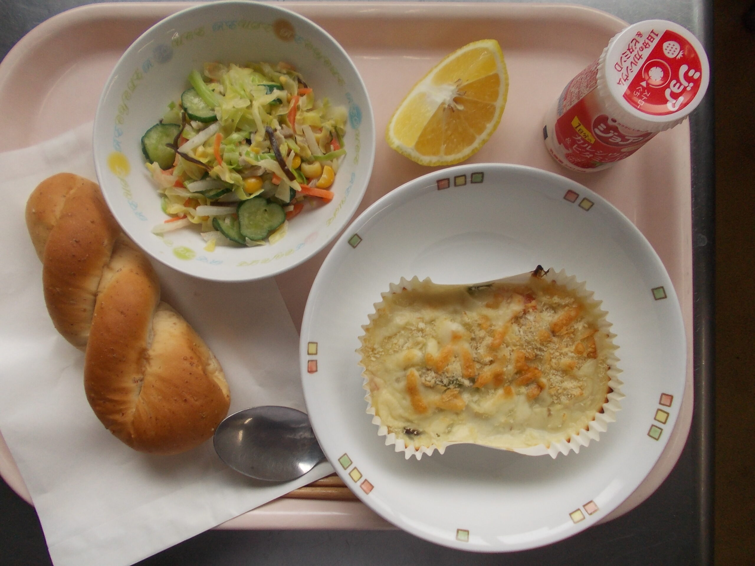 ライ麦パン、ポテトグラタン、和風コールスローサラダ、はるか、ジョアストロベリー