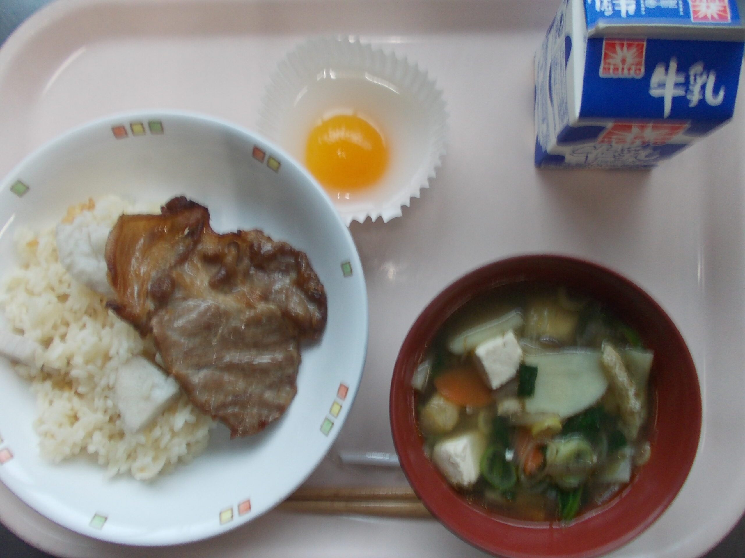 里芋ごはん、豚しょうが焼き、けんちん汁、お菓子な目玉焼き、牛乳