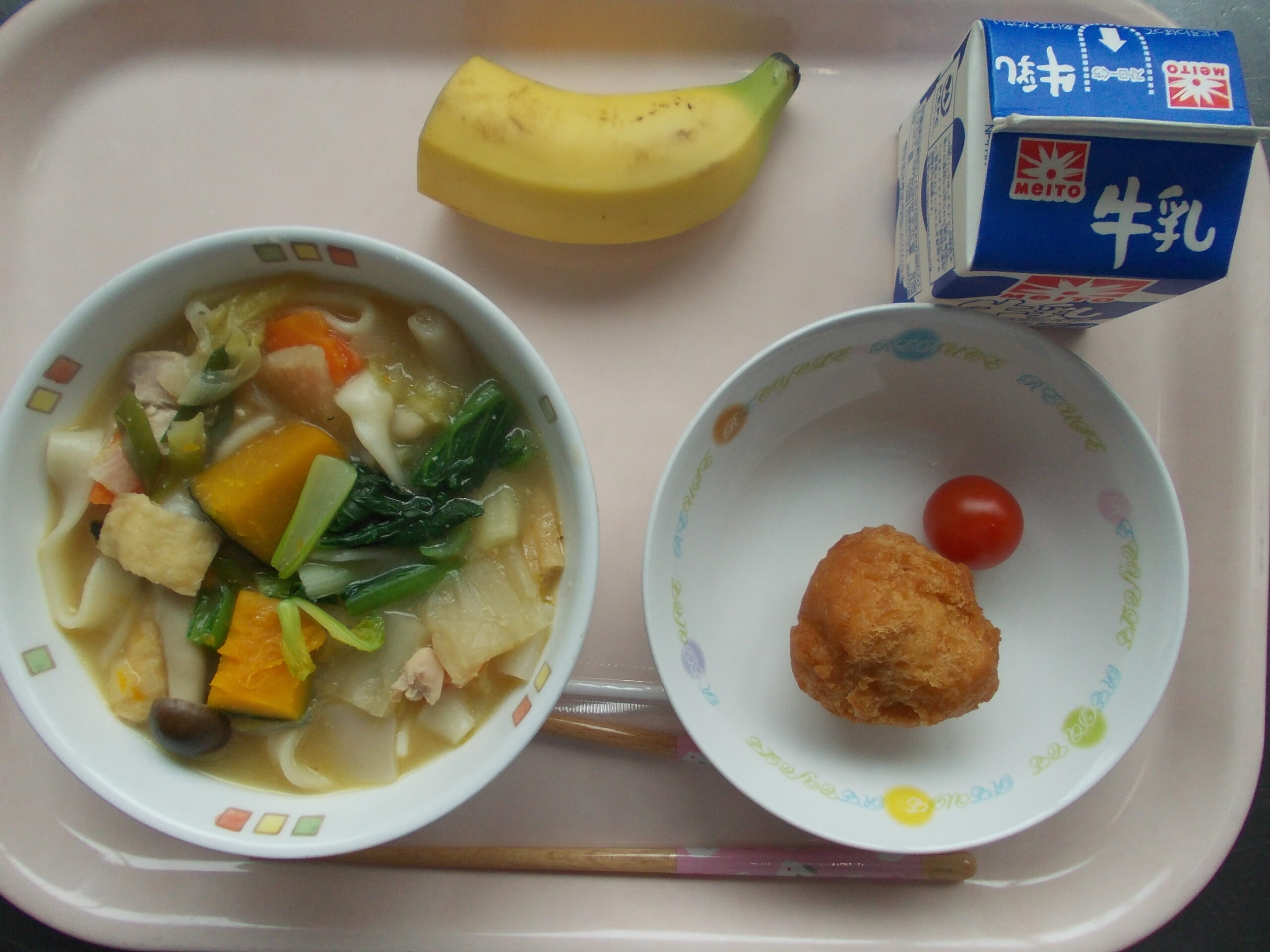 ほうとううどん、サーターアンダギー、ミニトマト、バナナ、牛乳