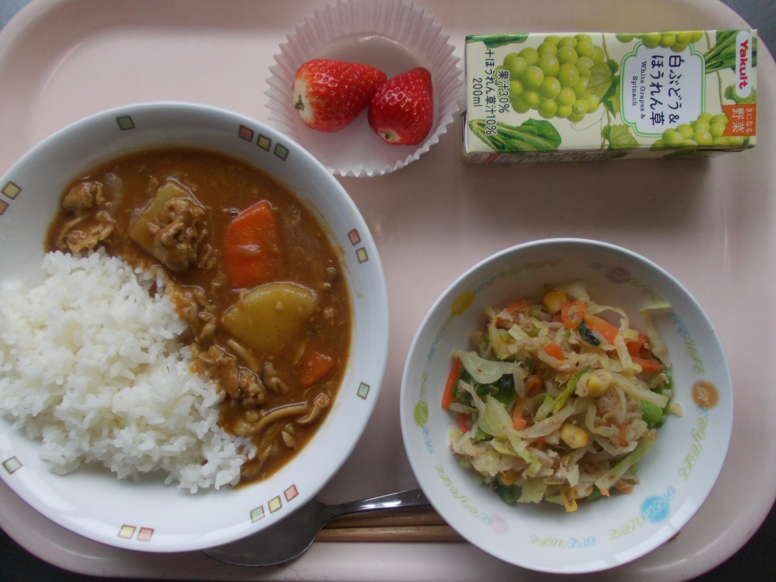 ポークカレーライス、切干大根おかか和え、いちご、野菜ジュース